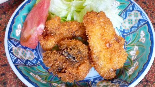 これも珍しいんでは? 白ミル貝(島ではナミガイとも言います)のフライです、これも結構面白いですよね。 |