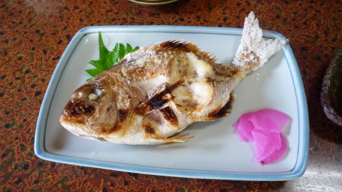 帰りに温泉に入るかもって タオルを用意しましたが、やはりカラオケが始まり 終わりませんでした。 ←上は鯛の塩焼き、下は車えびのおどりを塩焼きにしてもらいました。 |