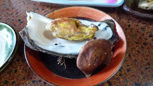 大きな”岩牡蠣” この牡蠣殻の大きさを見てください、でも グラタン風に調理すれば三分の一になってしまいます、が プリプリで最高です。 生で食べたい! |
