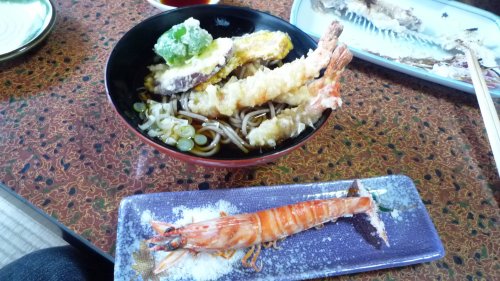 天婦羅にするのには 勿体無い”車えび”これを3本も う〜ん 贅沢、プリプリで最高! 天汁代わりの日本蕎麦の上に乗っかっています。 車えび(オドリ)は何時ものように 塩焼きにしてもらいました。 |