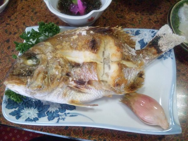 | 大きなイワガキホクホクです。 | 真鯛の塩焼き、脂がのってしっとりと! |