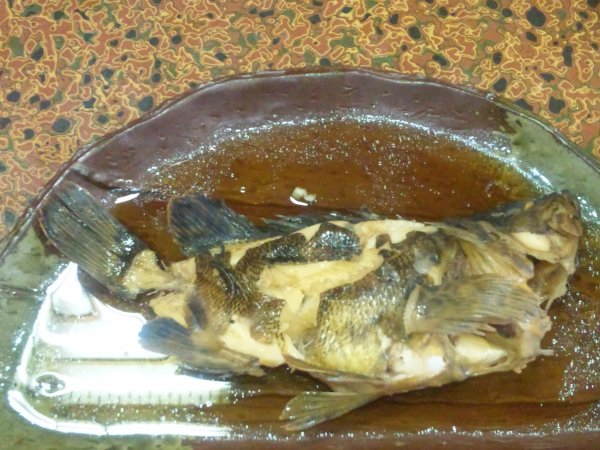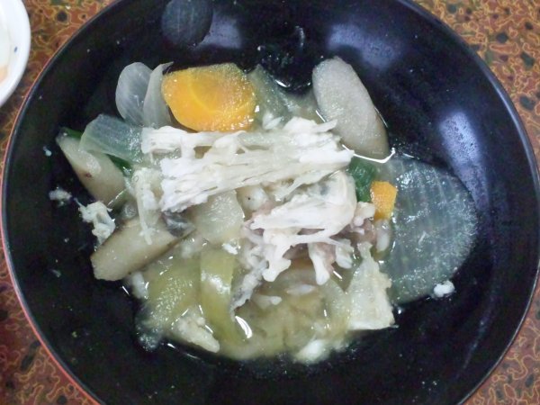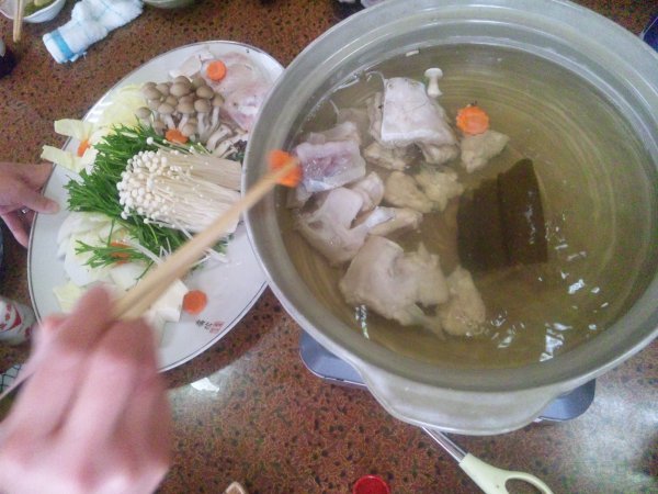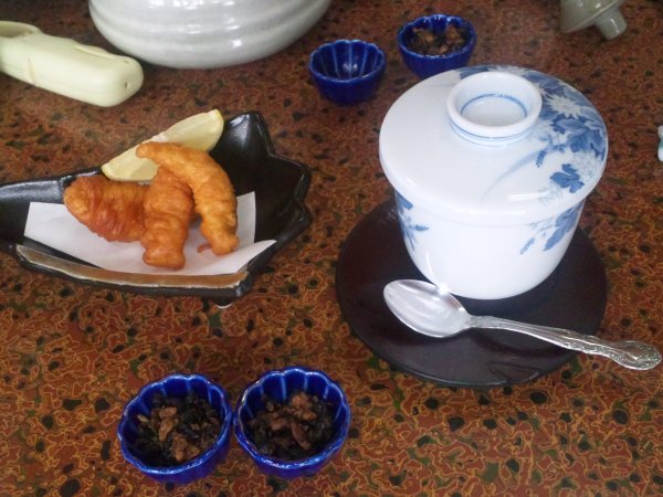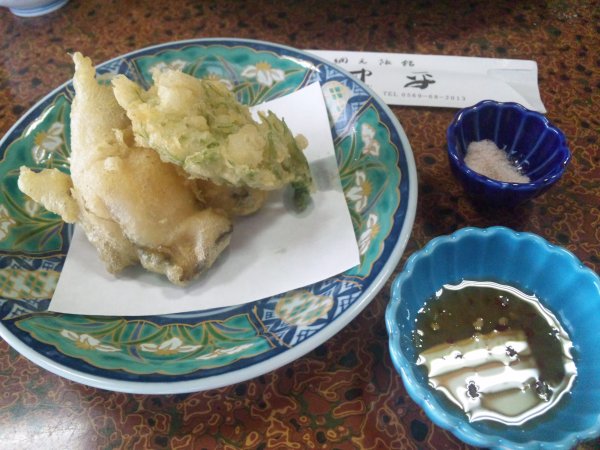 | 何時は私の仕事の”鍋”今日は千夏ちゃんが、いっそう美味しくいただきました。 | トラフグの天ぷらとスキ身入りの茶碗蒸し、小さい入れ物は女将さんからのサービス”へぼ”佃煮でなく自家製!新城のお客さんから沢山いただいたようです。 |