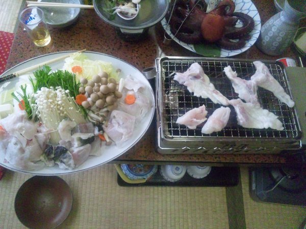 | 5人だからと大きな”茹で蛸!”分けて包んでもらってお持ち帰りです。大アサリの酒蒸し、ひれ酒ゴクリ! | テッチリの河豚を何時ものように塩焼でいただきます、ワガママ。 |