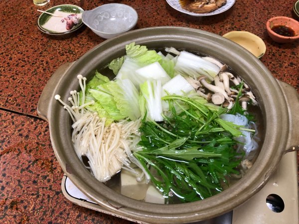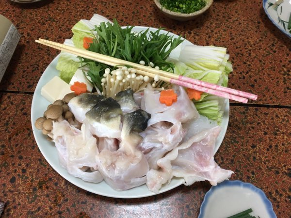 | テッチリ 野菜の下にはぶつ切りの切り身が | テッチリの具材 ぶつ切りは人数分取って塩焼き行きしてます |