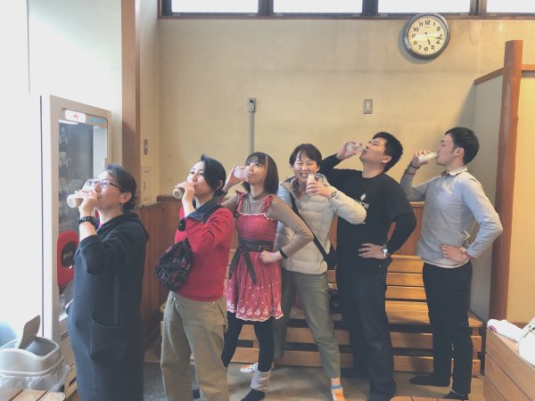 | 温泉を出てお決まりの”腰手で牛乳”爆笑 |