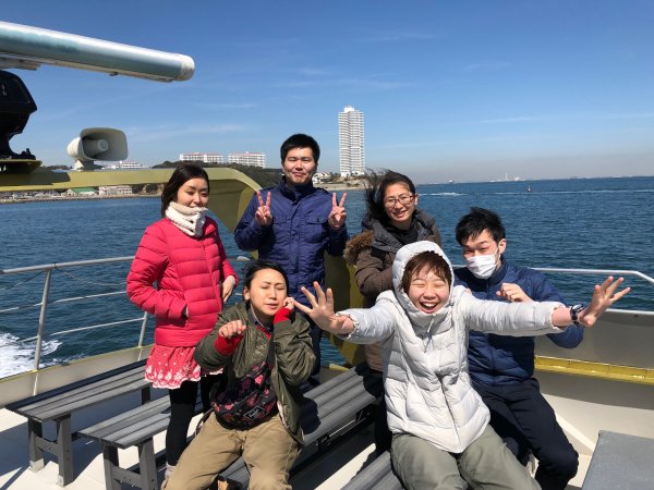 | 海上タクシーのデッキで出発 (笑) | あっぱれタコ前で記念撮影 定番です |