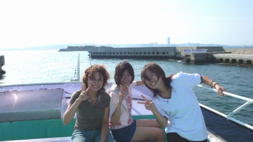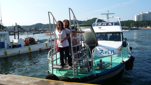 | 帰りに 海上タクシーへ乗り込む メンバーです、 | 今日は初めて”片名漁港”を利用しました。良い天気で皆でデッキに上がって帰ってきました、左、榊原 右、酒井 向こうに片名の右手の”知多ナポリ”が見えます。 | |