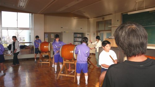 今回は太鼓初めての生徒が殆どでした、前回と同じく”八丈太鼓”を叩いてもらいましたが1時間で殆どの生徒が叩けるようになりました。 校舎の工事中で狭い部屋での練習になってしまいましたが それなりに楽しんでもらえたようです。 |