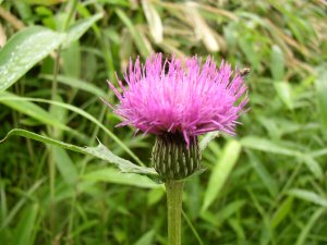 左、碁盤石 昔碁の強い天狗がこの山頂で村の天才碁打ちと7日7晩対戦して負け 怒って碁盤(碁岩?)をひっくり返したそうです、もう一度ひっくり返せば碁盤の目が出てくるんでしょうか?私は天狗(どこの山にも天狗伝説は有りますが・・・)とは 修行僧の事と思っていますがこの山は修行するような山では無いような?? 右、綺麗な野アザミが咲いていました。 |