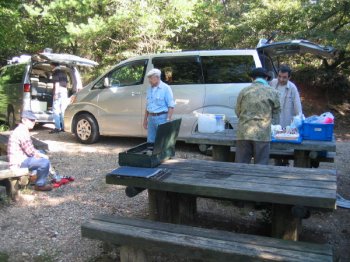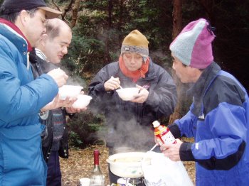 第一駐車場での”キムチ鍋”の食事! 左、左向こうからJA2RHR溝口さん・JO2PWK安藤さん・JR2TZK田口さん 右、熱々の鍋を食べる左から 田口さん・溝口さん・アンチャン・私・・・撮影、JE2DUD中村さん。 |