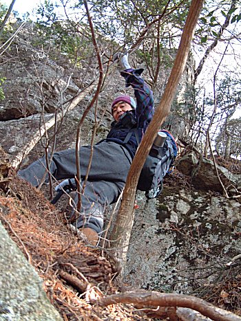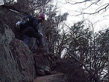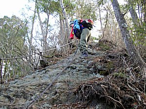 鹿島・大鈴分岐からグミンダ峠へ大下りして 平山明神山に縦走の途中の岩場越えです、ここはまだ手掛かりが有りますが 一箇所斜めに登る手掛かりの無い岩場があり頼りないロープがありました。 見てください 私の嬉しそうな顔を・・・。 |