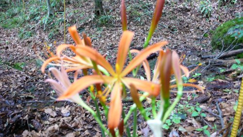 そこ此処に少しづつ群生してる”オオキツネノカミソリ”です。 オレンジ色で高さは2〜30cm 茎だけが伸びて途中から2〜3本に増えてその先端に花が咲きます。 周りはケヤキ林です、周りの緑にオレンジが映えます。 温泉の続き・・・ホテル岡田屋のお風呂湯は加熱はしてるが加水はしてないそうです、檜の内湯だけだそうですが外に宇連川?を見てロケも良いようです。 |