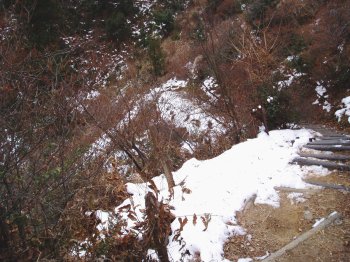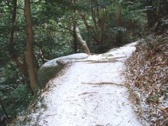 左、猿投神社サイドから簡易舗装された林道を行ける所までと上れば 東ノ宮の鳥居まで行けました、準備をして10.27歩き出しました。 右、東海自然歩道の登山道で整備されて歩きやすい道に薄っすらと雪が・・・綺麗でした。 |