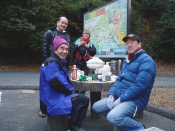 今日の参加は JO2PWKアンチヤン・JA2RHR溝口さん・JR2TZK田口さん・JE2DUD中村さんの5名です、山頂では風も無く大勢の地元の人たちと日の出を待ちますが残念ながら低い雲が一杯に広がっています、諦めてアンチャンにコーヒーをご馳走になってつまみは田口さんのシュークリームです、下山後場所を探すまでも無く駐車場の隅の椅子・テーブルを借りて”キムチ鍋”ウドンも入れていただきました、中村さんは用事で先に帰り残りで蒲郡のラグーナの湯へガラガラでゆっくりできました。
