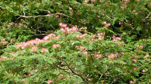 渋滞の153号を避けて設楽へ向かい三河路で鮎をいただいて田峰観音で1時間ほど昼寝して(酔いを醒まして)の帰り道 豊邦の鱒養殖場サイドにまだ花を付けた先日森岡さんに教えていただいた”ねむの木”の巨木がありました。 こちら方面でのもう1つのお勧めはお盆時期お墓参りに必要な花(ほうずき・小菊等)が無人販売所で格安で購入できます。 |