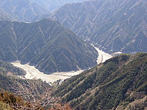 左、山頂から西側の展望台です、この画像からも分かると思いますが冬場以外は南側しか展望が利きません。 右、展望台から南南東の天竜川ダム湖、右側の湖の右手に白く見えるのがヘリポートです、急病とか緊急の時に必要なんでしょうね。 なんせ、陸の孤島 人口221人なんだから。 |