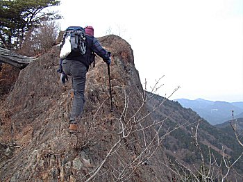 クサリ場鉄バシゴ等登っていくと痩せ尾根に出るしばらく進むと乳岩峡からの道と合流して巨岩のクサリ場を登ると