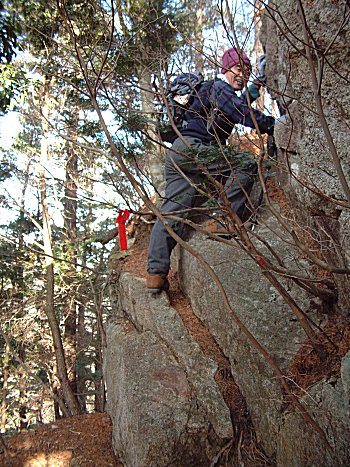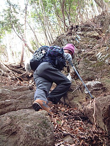 頼りないロープがあった岩場です、怪我をするのには違いないんですが北アルプスのように数百mも落ちてるわけではないので笑っていますが 斜めに登りだからまだ良いですよね これが下りだったら笑ってる余裕なんてありません。