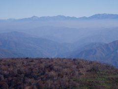 左、下山時木平湿原分岐の少し手前 急坂で日に当たって見事な薄緑の葉と赤い実です。 右、籾糠山山頂から東、北アルプスの山々です。 手前の前山の木々が見事に水墨画のようですが画像が小さくて残念ですね。 |