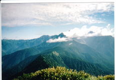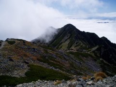 左、小仙丈ケ岳〜仙丈ケ岳への尾根、山頂直下からの山頂、左へは大仙丈ケ岳 右へは下山予定の仙丈小屋方面。 右、仙丈ケ岳山頂から仙塩尾根の大仙丈ケ岳、右に雲海に黒いのが 烏帽子岳・常念岳、左手の 富士山・北岳は見えませんでした。 |