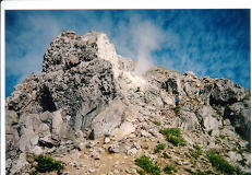 左、分かり辛い写真ですが、左手前から二つ目の尾根にロープウエイ西穂山荘も良く見えます、白い雲の上が西穂 すぐ右のガスの中の黒い点が奥穂・その右の黒いのが前穂です。西穂の左には北に続く南岳・中岳・槍 目には綺麗に見えますが写真ではなかなかね・・・・。 右、分岐からはこんなに綺麗な”焼岳”を見ながら左南峰右北峰間の最低鞍部、噴出すガスのすぐ左手に上がります。 |