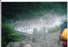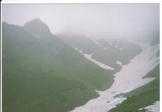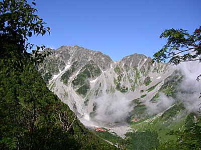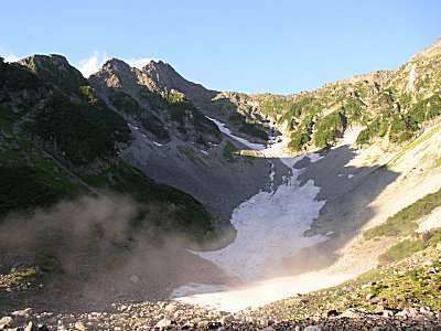 天気が悪い所に使い捨てカメラだから綺麗に写りません、雰囲気だけでも。 19日の帰りに撮りました水量が昨日の半分になっていました。 左、本谷橋それでも水しぶきが上がっています。 右、涸沢カールと北尾根。 |