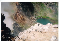 左、北峰の東側のガスの噴出です、直ぐ右下に3人歩いてますが分からないですね?風向きで息苦しくなるこんな所を歩いていて良いんだろうか? 右、北峰2393mから南側の火口の湖とその左から噴出すガスです。 |