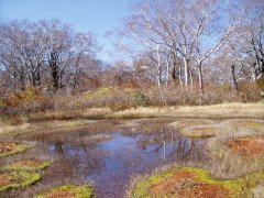 左、木平湿原近辺の葉は落ちて真っ赤な実が沢山付いた木ですがこれも他では此処まで大きい木は見たこと有りませんしずーと何本も続いています。 右、木平湿原です、小さな湿原ですが天生湿原よりずーと高い所に有るのに水量が有りますそしてその水面にダケカンバが写っています。 素晴らしい自然です。 |
