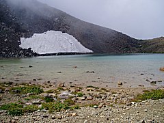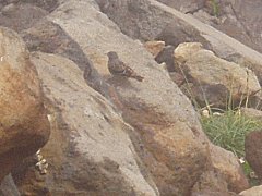 左、一瞬のガスの切れ間に撮った”二の池と雪渓”天気が良くて池に日が差していれば綺麗なエメラルドグリーン(ブルー?)が撮れると思います。 右、足元に飛んでくる小鳥です、20cm弱で全体にこの時期の保護色のこげ茶ですが、羽の下側は少し綺麗な色をしていました。 横井先輩から、イワツバメとの事でした、私が調べた範囲でもそうだと思います。 |