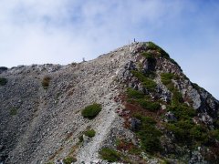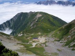 左、甲斐駒ケ岳 凄い迫力で迫ってきます、右は摩利支天13.00過ぎ下山時にガスの中から姿を見せました、次回はぜひ登りたいですね。 右、山頂からの仙丈小屋 こちらから馬の背向けに下山します、お花畑・水場が沢山あってシーズンには此方から登ったほうが楽だし楽しめそうですね。尾根上の山は八ケ岳です。 |