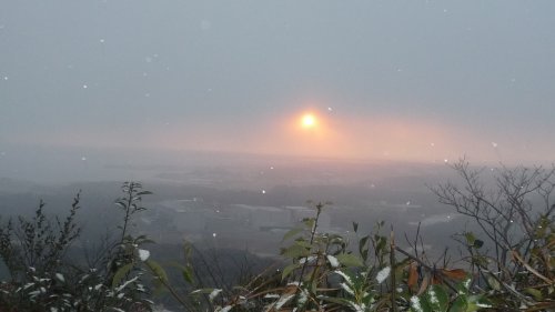 |  | 気温は−1度、左の写真に雪が写ってます、木の葉にも雪がついています。 左手の”富士山”は当然見えませんでした。 | |