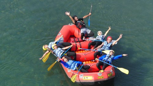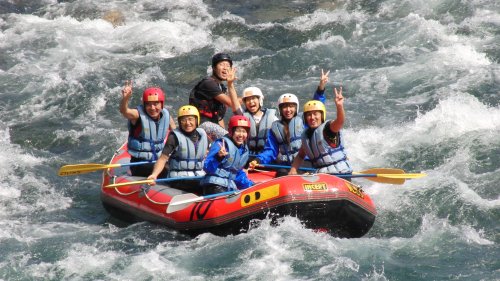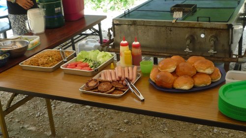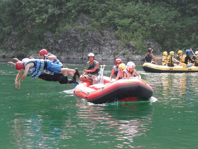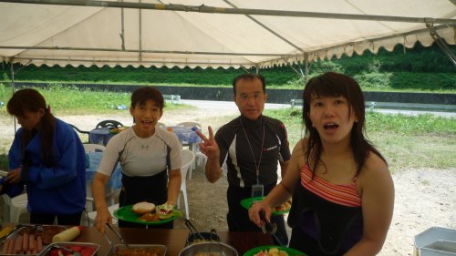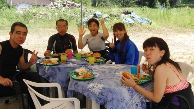 |  | 今年も連れてってもらいましたラフティング、今年はどう言う分けか?水に顔が浸かるたびにパニックに だからそのたびに水を飲んでる?ジッとしてれば浮いてくるのにね?? 昼の食事を皿に取ってるメンバー! | |