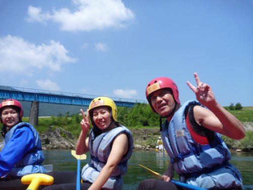 |  | 今回は私達9人と他に3人のグループ、一艇は同乗になりました、左から他のグループ3人 ハル・イナ・マリ、皆良い顔しています、今日も綺麗な長良川の水です。 | |