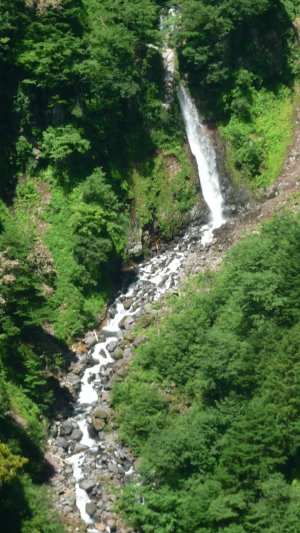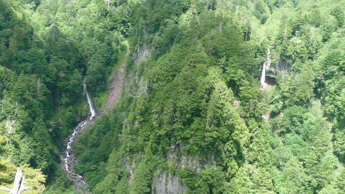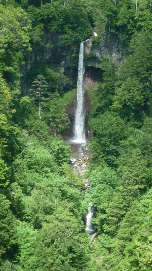 |  | 天気も良さそう、水量も多そうで、出かけてきました。 ←一番正面に見える滝です、直ぐ下にも続いてますが緑が多すぎて見渡せません。 → 左下の滝ですが”白”が一番鮮やかな滝です、剣が峰の方に見える”雪渓”と同じように”白”が輝いていました。 |  |
