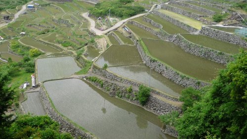 |  | 数日前に新聞に載った”四谷の千枚田” 田植えが終わったところで見頃です。 私の一番のお薦めポイント大代入口の林がわずかに切れた所からの眺めです。 | |