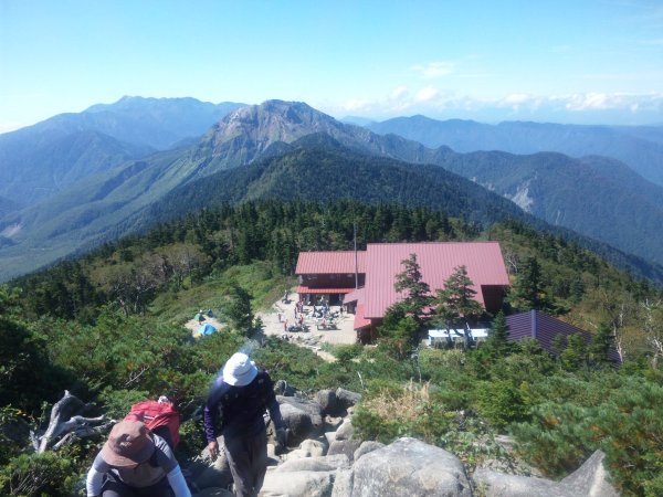 | 涸沢ヒュツテから下に涸沢小屋上に北穂高岳! |