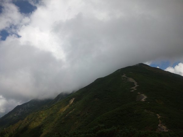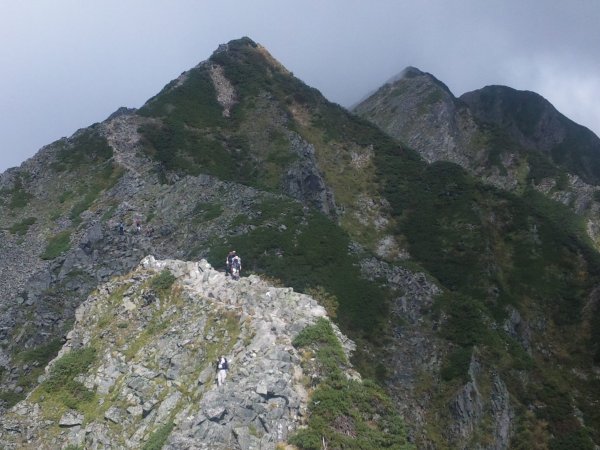 独標から下山する女性、直ぐ向こうのピークの右下にトラバース道があります手がかりも何もありません怖いでしょう! |