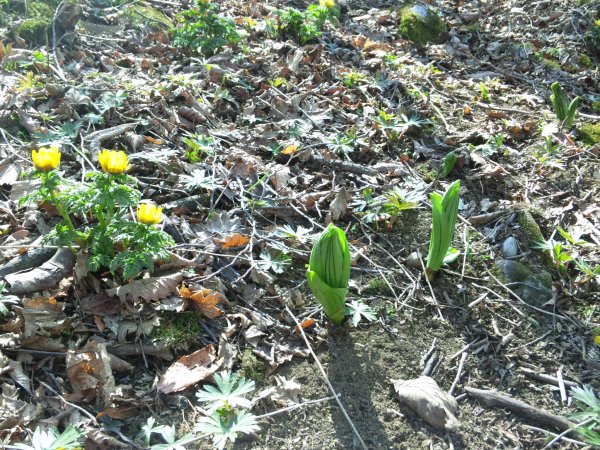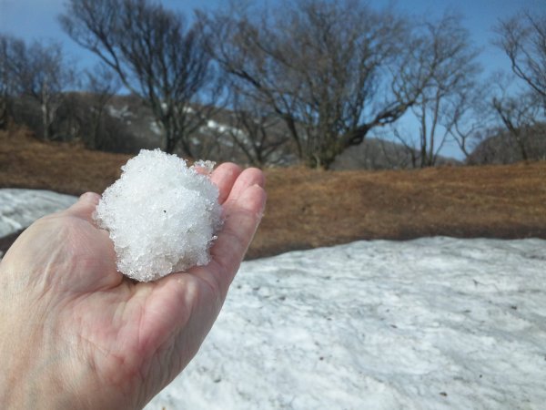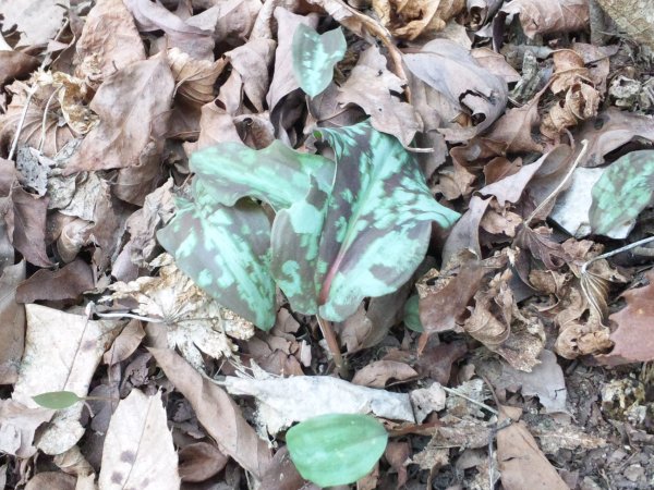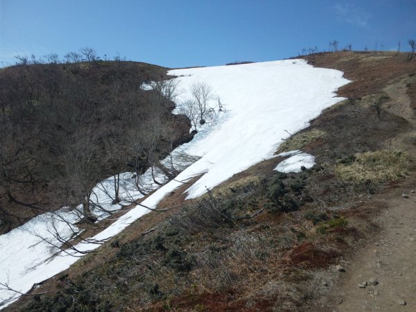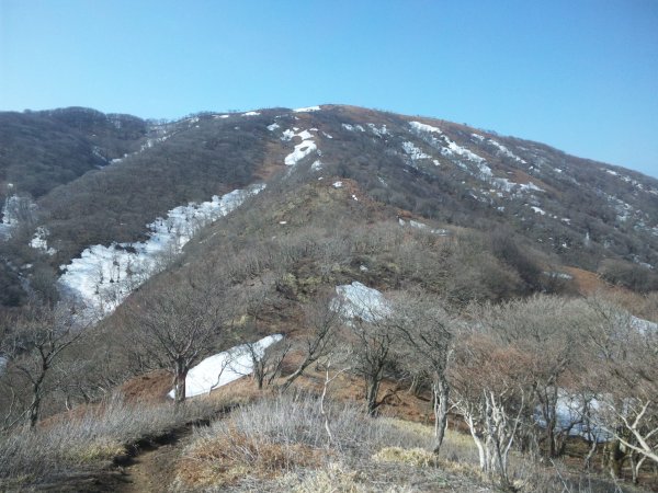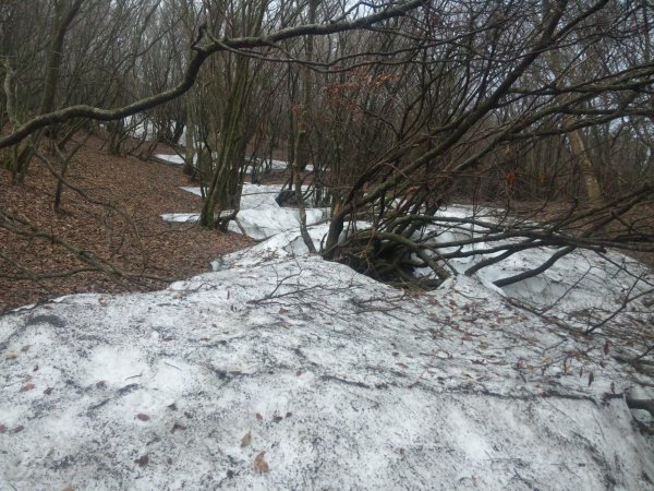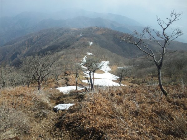 久しぶりの山行なので楽なコースそれもピストン(笑)それでも息があがってゼイゼイ・・・歩いてるより立ち止まって息を整えてる時間の方が長い(笑)簡易温度計で10度ザックにあたってるTシャツが汗で濡れています、尾根まで上がると東からガスが流れています、見通しが利きません、尾根をしばらく行くとまだ10aにもならないバイケイソウが数センチのカタクリの葉も、これは今年の冬は寒かったから山も遅いのか?これなら福寿草期待出来そうと内心ニコリ、薄日が差してガスが切れてくれば残雪が多いやはり今年の山の春は遅れてる、何か雰囲気が違う??気がつけば展望が利き過ぎ鈴鹿名物藪が無い?下山時に山人に聞いたらシダにやられて3年ほど前から笹が育たないだそうです、藪コギをしなくて良い、展望が利くでも春に沢山出るネマガリタケが頂けなくなりますね食いしん坊の私にはどちらが良いのか?写真を撮ったり雪渓の上を遠回りしたりでゆっくり上って山頂へ笹薮がないから日本庭園も綺麗に見えます、遠くに冷川の頭もかすんでいます見るもの皆久しぶりです、目的の福寿草目指して移動アレーッと諦め掛けてもう少しと進んで見つけました福寿草・バイケイソウ・ヤマネコノメソウが下ってる斜面の見える先までズーと咲いています、やはり春は遅れているようで咲き始めたばかりです、開いてるバイケイソウなんてありません、ここの福寿草まだ2〜3週間は楽しめそうですね、アセビもまだこれからだし、帰りに石榑トンネルを見に行ったんですが宇賀渓近くでミツバツツジが少し咲いていました、今年は又以前のように縦走で一気に幾つもの山で無く今日のようにゆっくりと歩いてみようかと思います。久しぶりに楽しい1日でした。