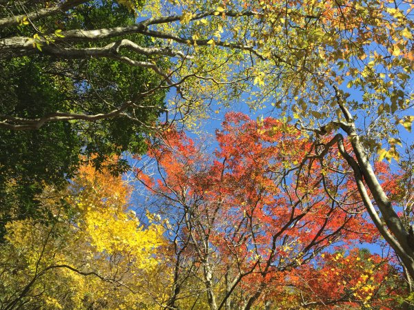 昨年雪で御菊池から引き返した三池岳へ行って来ました、7時30分八風キャンプ場先の登山口には一台も車が止まっていません、今日も1日山人と会わないのかなって尾根周り(反時計回り)で登ります、キツイ登りになると風で山が唸りでしました、尾根へ出ると大変かなって心配しながら登ると尾根に出る前から北向け開いた所では凄い風です、御菊池は前回雪で見えませんでしたが今回は落ち葉に埋まって見えませんでした(笑)御菊池先では北側が崩落したトップを暫く歩く所が強風が吹きつけ腰を落として身構えて歩かないと飛ばされそうな・・・三角点、山頂を過ぎ八風峠へ下りかけると嘘のように静かな山行に代わり強風で耳が冷たく用心に持って行った毛糸の帽子が汗で濡れ始めの帽子戻す程でした、尾根では9度西コースを八風沢まで下り日向ぼっこで休憩時には20度でした、紅葉は500bぐらいまで下って見ることが出来ました、尾根側では紅葉は殆ど駄目で八風峠コースで楽しめます、登るのも西の方が岩場も無く楽です。