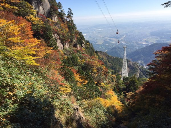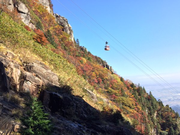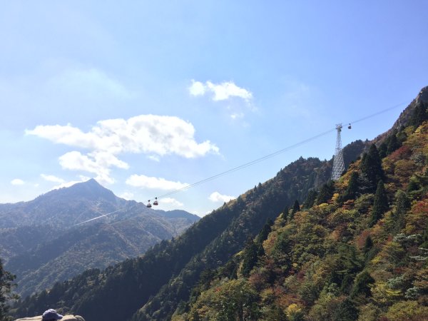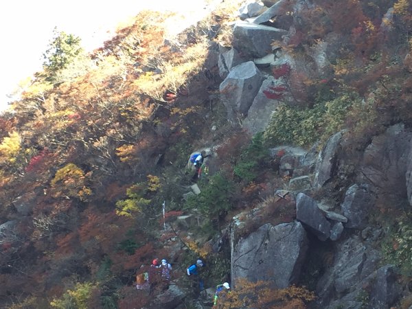 | 朝陽台下の岩壁の紅葉とロープウェイ | 中道の岩場を行く山人達 |