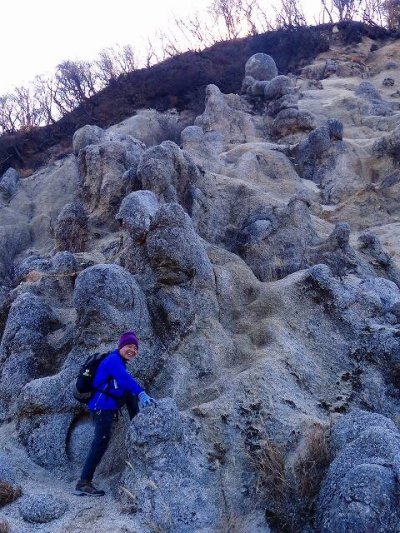 | 岩が風化したガレ場で遊ぶ私 | カズラ谷の結構立派な滝 |