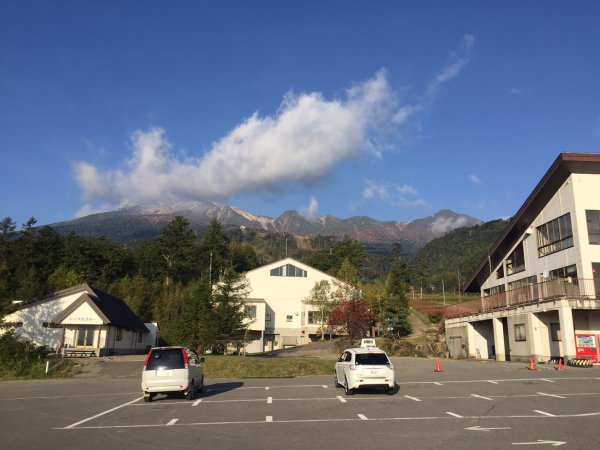 | 朝ロープウェイ駐車場からの御嶽山南側の火口からは 白くガスが噴いていました |