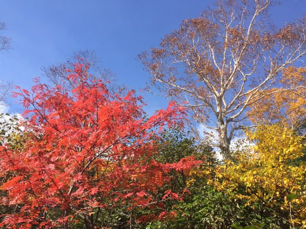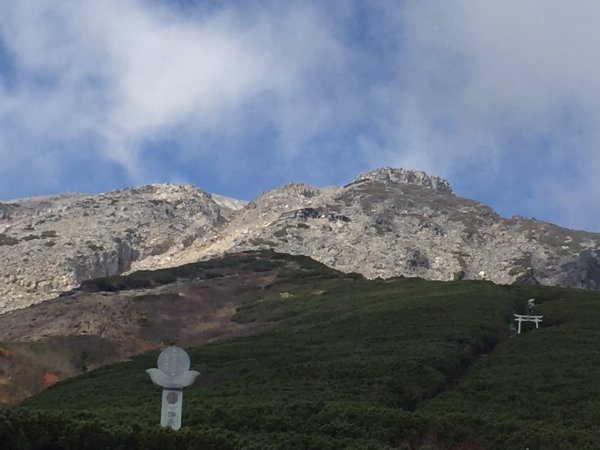 | 9月19日から9合目石室山荘と三の池方面も屏風岩手前まで入山出来るようになり友人と参拝に行って来ました、黒沢口ロープウェイ登り口と山頂駅そして女人堂に献花台が用意してありました、石室山荘前にもあるそうです、三の池方面への登山道にも噴火の火山灰が積もっていましたやはり大変な噴火だったのが良く分かります、二年ぶりの御嶽山です、友人ヒロ君とは三回目の山行で始めての晴天(笑)ロープウェイで一緒だった地元のパトロールに聞けば数日前の爆弾低気圧の強風で8合目付近葉が落ちて全滅って、半分諦めての山行になりましたが風下とかナナカマドの葉が落ちた木でも実は真っ赤に残っていたりでそれなりに楽しめました、紅葉の色付きは今年は良いようでした。 登り1時間20分 下り1時間でした、幻の滝は見ることが出来ませんでした。 |