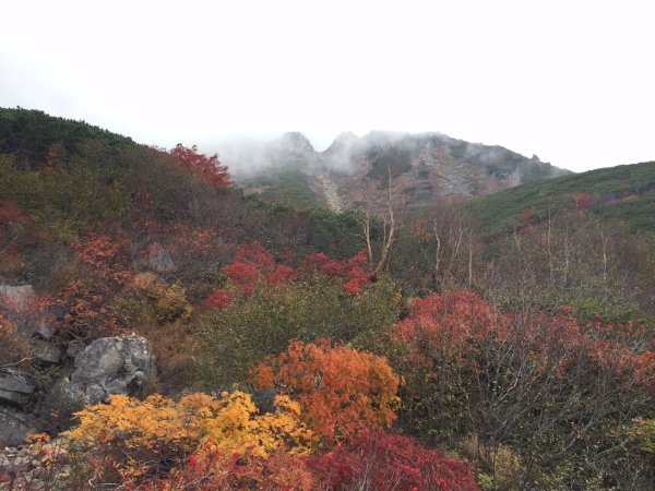 女人堂上からのナナカマドと山頂です、風下では 綺麗な 紅葉を楽しめました |