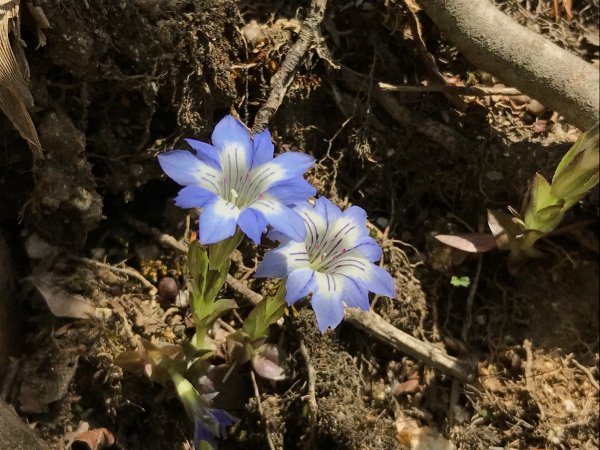 | 上部では沢山の ハルリンドウ | 帰りに新道下部で咲きだした コイワカガミここでは群生してます |