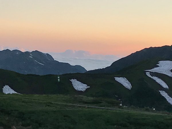 | 別山乗越〜剣山荘には沢山のライチョウが左は雄 | みくりが池からの夜明けの雲海 |