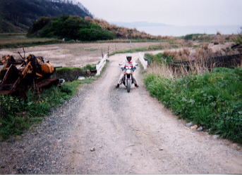 2qほどの海岸線沿いのフラットダート、砂で滑り非常に危険。