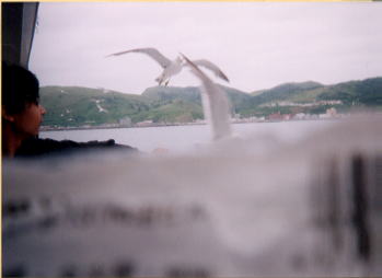 フェリーを追いかけてくるカモメ?に手渡でかっぱえびせんをやる。