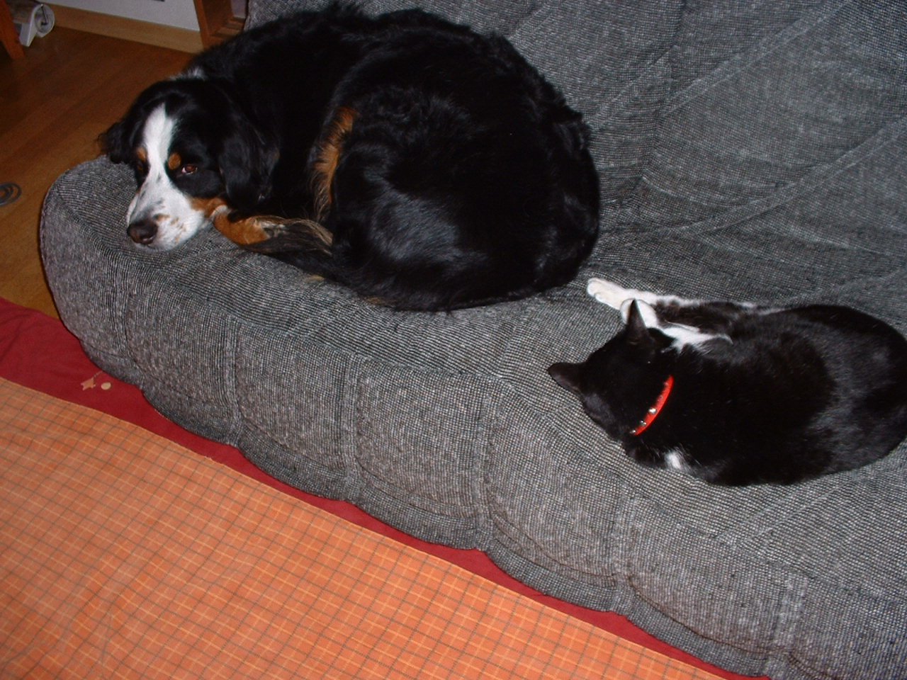 している2匹だが仲良くお昼ねしている時もある。けんかの原因は大抵華の「くんくん攻撃」でおしりのにおいを嗅がれると