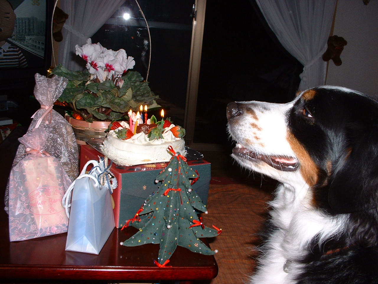 ボーン、牛のひずめ、クッキー、チョーカー、くろには首輪と煮干。華は記念撮影の間もカメラよりケーキが気になって気もそぞろ